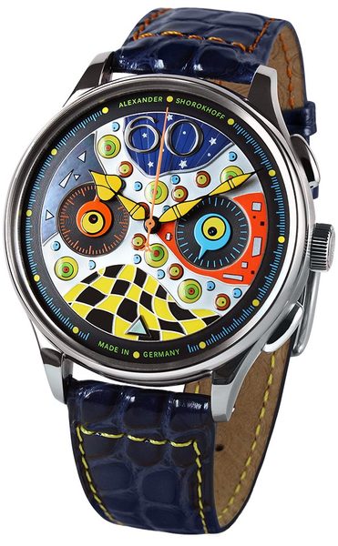 Hodinky Crazy Eyes Chrono navazují na řadu avantgardních hodinek značky Alexander Shorokhoff a nastavují nová měřítka z hlediska uměleckých designových nápadů a barev. Představivost Alexandra Shorokhova, inspirovaná uměleckými a jedinečnými díly Gustava Klimta, byla realizována v tomto novém chronografu.
