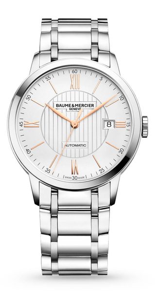 Model Baume & Mercier Classima M0A10374 má jednoduchý stříbřitý číselník se strukturovaným středem a růžovozlatými plastickými indexy střídajícími se na hodinových pozicích s římskými číslicemi. Celek vhodně doplňují na světlém podkladu…