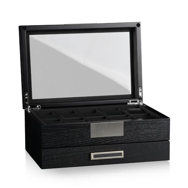 Elegantní box na hodinky Heisse & Söhne Monteray 10+ 70019-109 na 10 kusů hodinek s proskleným víkem. Vyrobeno z dřevěné dýhy černé barvy, se semišovým interiérem a kovovými detaily na víku. Box navíc obsahuje úložný prostor pro další drobnosti, např. manžetové knoflíčky, kravatové spony, prsteny atd.