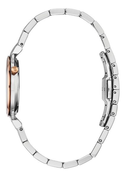 Hladký černý ciferník, jenž je podkladem plastickému logu značky a tištěným římským číslicím na pozicích hodin, je chráněn safírovým sklíčkem. Elegance modelu je podtržena použitím subtilních ruček bez nánosu luminiscence, úzkou lunetou a celkovou výškou pouzdra pouhých 5,5 mm. Pouzdro i náramek hodinek jsou…