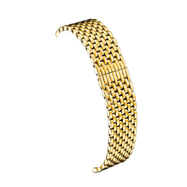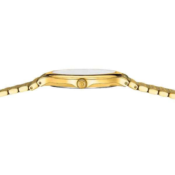 Pouzdro o průměru 33,5 mm je vyrobeno z nerezové oceli 316L se zlatou PVD povrchovou úpravou. Černý perlěťový číselník tvoří dokonalý podklad pro elegantní ručky v barvě pouzdra. Výrazným prvkem modelu jsou kromě zlatých římských číslic také čiré krystaly, jež jsou usazené na pozicích indexů. Vše je chráněno kvalitním safírovým…