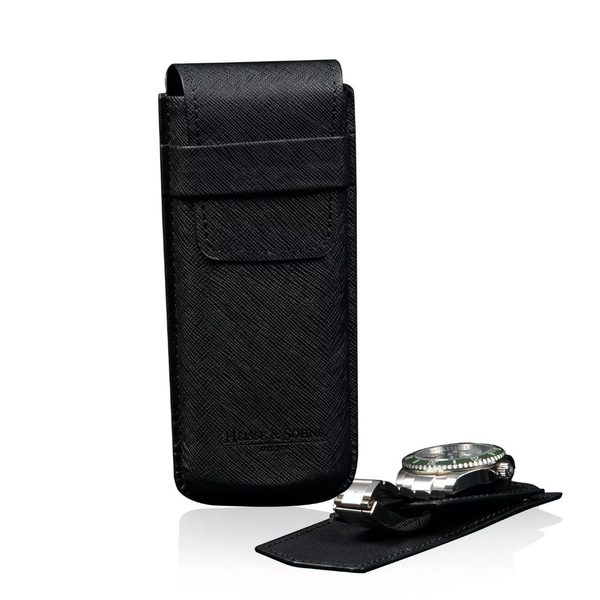 Cestovní pouzdro Heisse & Söhne Mondo Safiano 70019-102 pro 1 kus hodinek. Vyrobeno z černé syntetické kůže s černým prošitím.