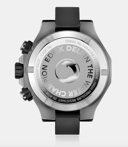 Pouzdro hodinek je vyrobeno z kvalitní ušlechtilé oceli, na které navazuje kaučukový řemínek s trnovou brandovanou sponou. Černý ciferník chrání safírové sklíčko, jež je odolné vůči jakémukoliv poškrábání.