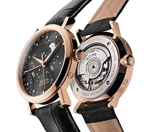 Model Epos Oeuvre D’Art 3440.322.24.14.25 disponuje ukazatelem měsíční fáze, či ukazatelem dne v týdnu a dokonce i ukazatelem aktuálního kalendářního měsíce. velká ručička zakončená půl měsícem ukazuje na aktuální kalendářní den po vnitřní lunetě hodinek. Samozřejmostí je čistě safírové sklo s antireflexní vrstvou.