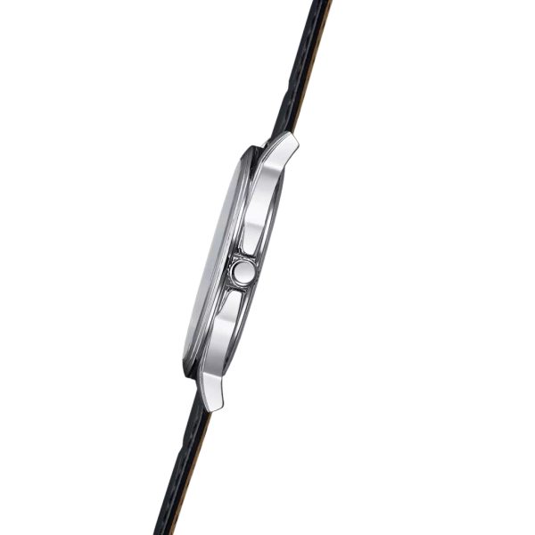 V ocelovém pouzdře o průměru 39 mm je usazený modrý číselník s kovovým efektem, který je dokonalým podkladem pro elegatní ručky a indexy. Na číselníku chráněném minerálním sklíčkem se na pozici 6. hodiny nachází jednoduchý ukazatel data.