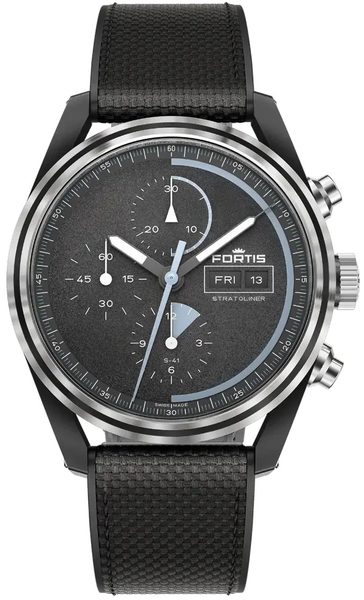 Hodinky Fortis Stratoliner S-41 Gravity Black F2340018 mají pouzdro vyrobené z recyklované ušlechtilé oceli s černou DLC úpravou,…