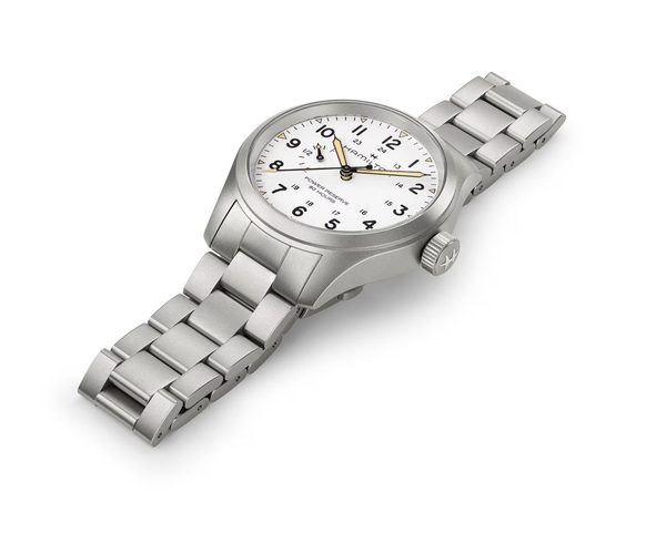 Modely Hamilton Khaki Field Mechanical Power Reserve ctí tradiční design a základní funkčnost rodiny Khaki Field a zároveň přináší moderní prvky a nejnovější hodinářské technologie a inovace. Díky novému manuálně natahovacímu strojku H-23, vyvinutému společností ETA exkluzivně pro Hamilton, umožňuje (poprvé) vizualizaci 80hodinové rezervy chodu přímo na ciferníku. Bílý ciferník, opatřený robustním khaki zeleným řemínkem NATO, hrdě zobrazuje „rezervu chodu 80 hodin“ a „F“ pro plnou a „E“ pro prázdnou…