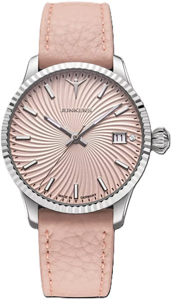Pouzdro hodinek Junkers Victoria 970.92.09 je vyrobeno z ušlechtilé oceli a hodinky na ruce drží díky koženému řemínku světle růžové barvy se stříbrnou trnovou sponou.