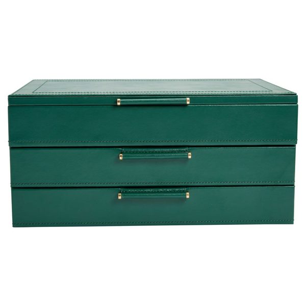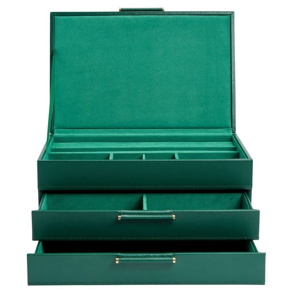Šperkovnice Wolf Sophia 392012 zelené barvy se zeleným interiérem. V kolekci Sophia se klasika snoubí se současností. Šperkovnice Sophia se zásuvkami je ideální pro přehledné uložení cenných šperků. Potažena je kvalitní kůží s kovovými doplňky zlaté barvy.