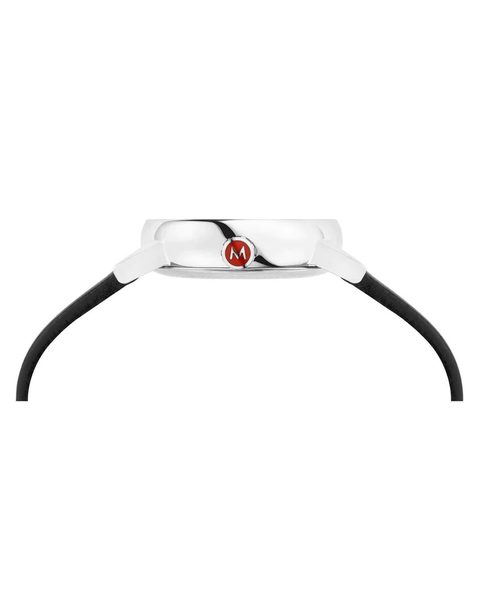 Pouzdro modelu Mondaine MSE.26110.LB je vyrobeno z ušlechtilé oceli a hodinky na ruce zdrží díky řemínku vyrobeného z veganské kůže černé barvy s klasickou trnovou sponou.