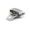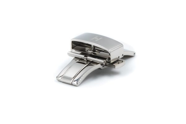 Motýlová spona s lesklou stříbrnou úpravou. Určena pro řemínky s maximální tloušťkou zakončení cca 3,6 mm.