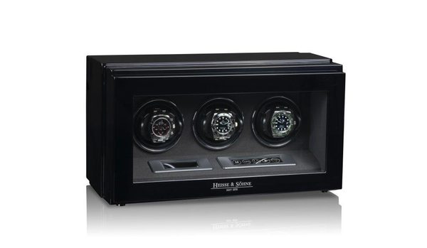 Natahovač Heisse & Söhne Watch Master 3 70019-242.142 pro 3 kusy mechanických hodinek s automatickým nátahem. Tento krásný model splňuje nejvyšší stardardy ohledně nové technologie a designu. Tělo natahovače je vyrobeno ze dřeva v černém piano lesku, dvířka jsou opatřena minerálním sklem.
