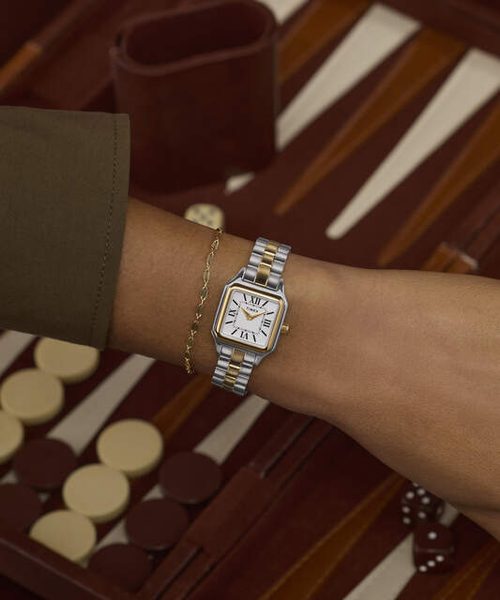 Mosazné pouzdro o průměru 23 mm je opatřeno leštěnou povrchovou úpravou v bicolor provedení. Bílý číselník slouží jako dokonalý podklad pro štíhlé ručky v barvě pouzdra. Nepřehlédnutelným prvkem tohoho dámského modelu jsou výrazné římské číslice. Vše chrání minerální sklíčko.