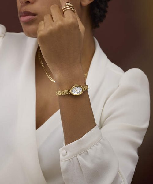 Mosazné pouzdro o průměru 19 mm je opatřeno zlatou leštěnou povrchovou úpravou. Bílý číselník je dokonalým podkladem pro štíhlé ručky v barvě pouzdra. Nepřehlédnutelným prvkem tohoho dámského modelu jsou výrazné římské číslice. Vše chrání minerální sklíčko.