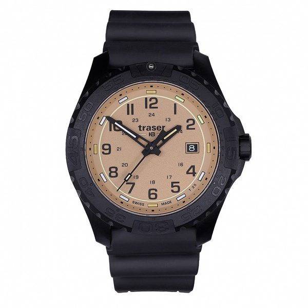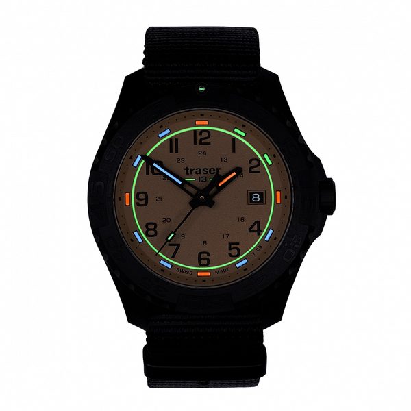 Pánské hodinky Traser P96 OdP Color Sand Rubber Black vychází z oblíbených modelů Traser P96 Outdoor Pioneer Evolution. Zajímavostí u tohoto modelu je využití různých barevných tritiových bodů. Na ciferníku se tak střídá zelená, oranžová a modrá barva.
