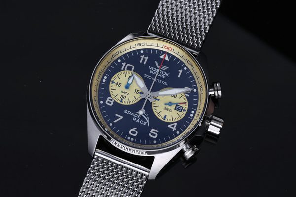 Pánské hodinky Vostok Europe Space Race Chrono Line 6S21-325A667B patří do modelové řady Space Race. SSSR a USA soutěžilo o převahu v kosmických letech. Začalo to vypuštěním umělé družice v roce 1957, pokračovalo robotickými vesmírnými sondami k Měsíci, Venuši a Marsu, což vyvrcholilo vysláním lidí na oběžnou dráhu Země a nakonec na Měsíc. Vesmírná mise Apollo-Sojuz z roku 1975 byla symbolem spolupráce mezi oběma stranami a ukončením vesmírného závodu.